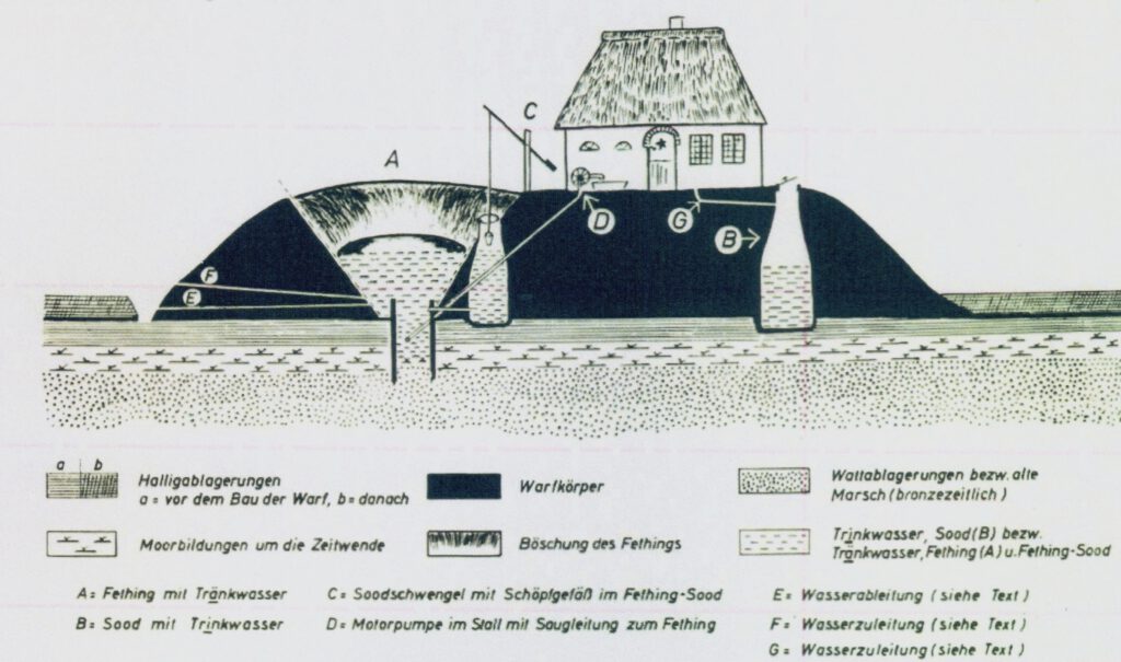 Für die Versorgung der Menschen wurde das vom Hausdach herablaufende Regenwasser (G) in einer vor Schmutz geschützten Zisterne gesammelt, „Sood“ (B) genannt, das niederdeutsche Wort für Brunnen. Er war aus Steinen und Lehm aufgemauert. Da die Dächer mit Reet gedeckt waren, nahm das Wasser eine leicht gelbliche Färbung an, was den ersten Sommergästen auf den Halligen recht merkwürdig erschien.